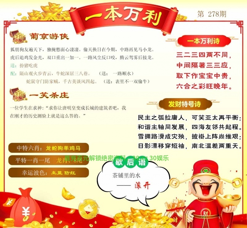 278期:九肖【蛇狗马鸡鼠兔龙羊】开:虎28准